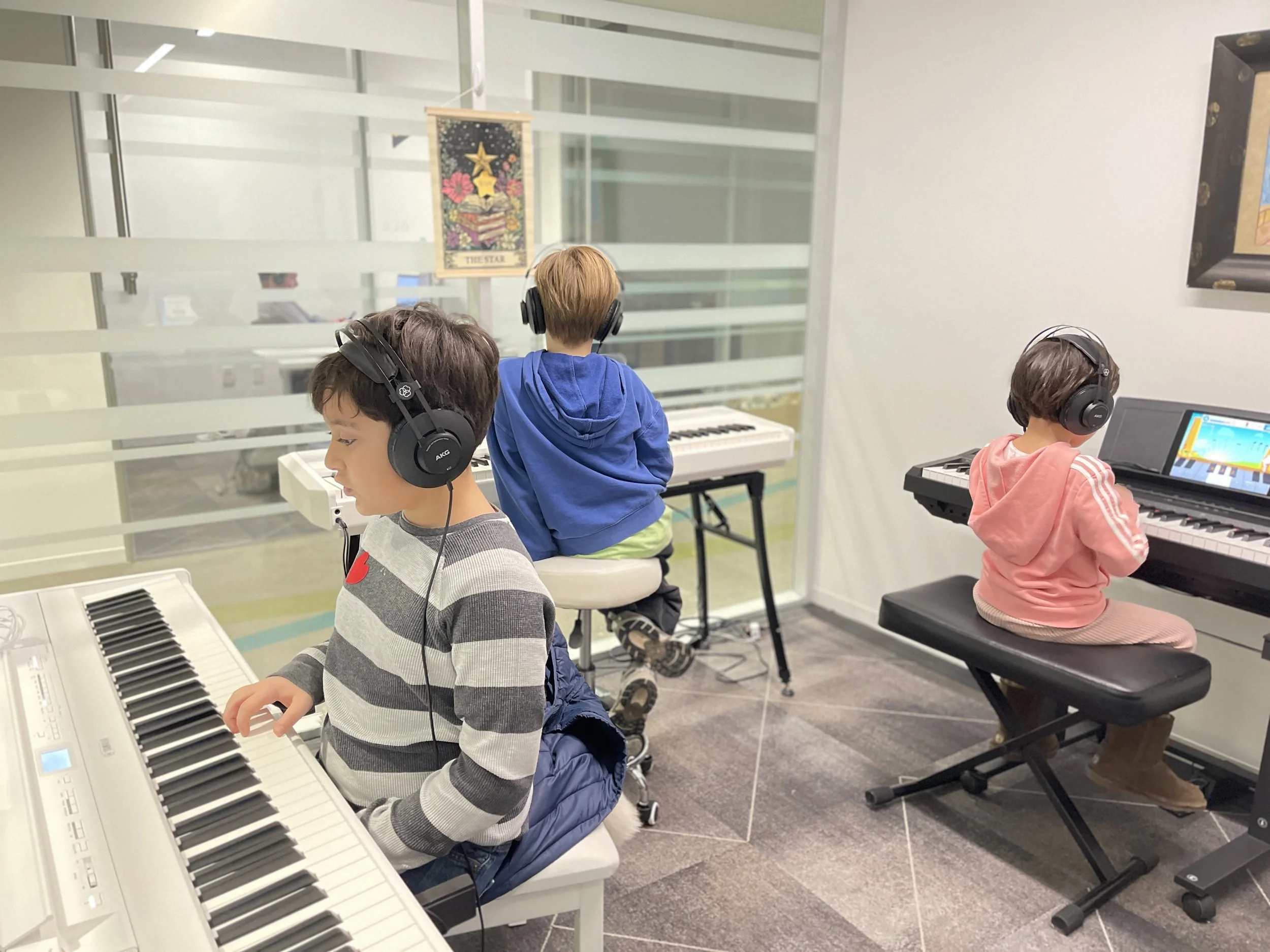 Semi-private students at Obbligato Music practicing on Yamaha P-525 and Yamaha p-71 digital pianos.